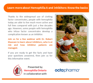 Join Hemophilia Ontario in collaboration with octapharma for a live webinar with Dr. Robert Klaassen to learn about inhibitors, who is at risk and how inhibitor patients are managed.