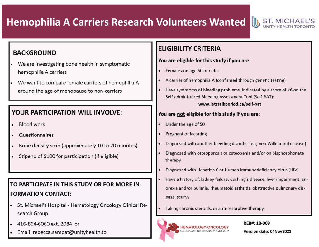 St. Michael’s Hospital (Toronto) and Kingston General Hospital (Kingston) in Canada are conducting a study on bone density in women who are carriers of hemophilia A around the time of menopause compared to women of the same age who are not carriers.