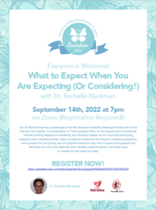 Join Dr. Rachelle Blackman, hematologist at the New Brunswick Hereditary Bleeding Disorders clinic at the Moncton City Hospital, for a presentation of “What to Expect When You Are Expecting (Or Considering!)”