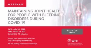 On Thursday July 30 at 10:00am (EST), the World Federation of Hemophilia (WFH) will be hosting a 75-minute webinar for people with bleeding disorders to address concerns related to maintaining joint health during the COVID-19 pandemic.